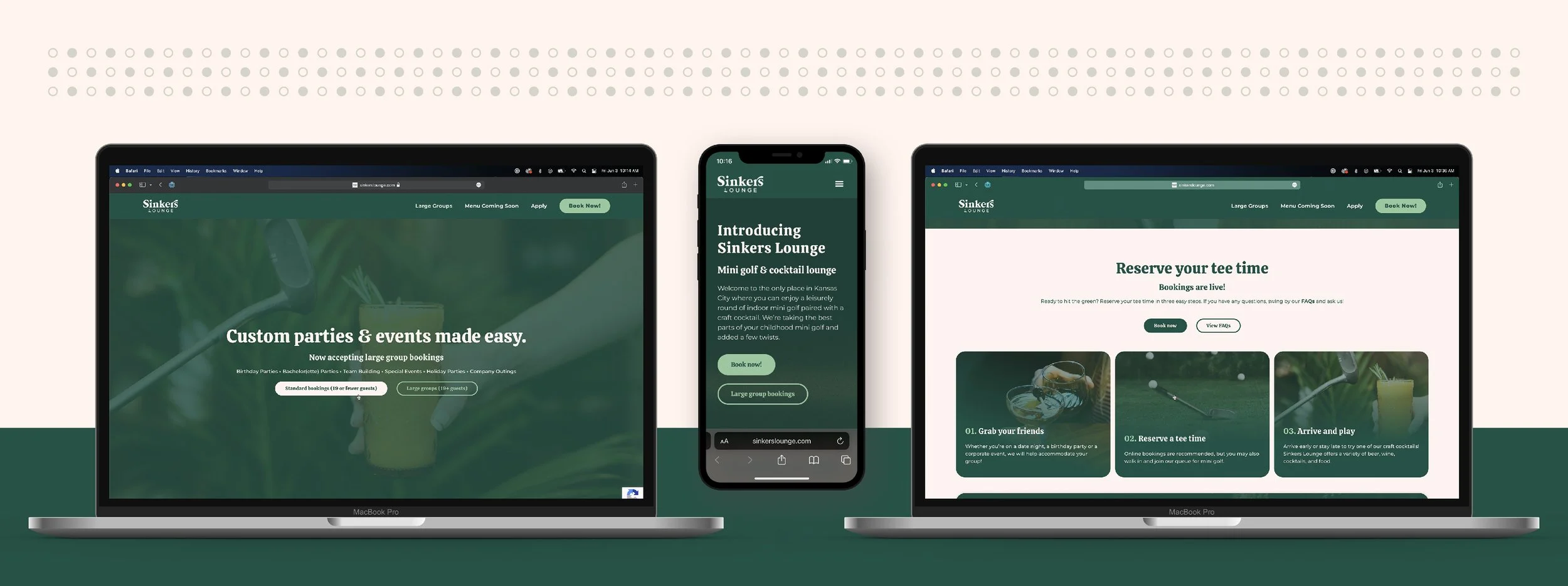 Sinkers Lounge’s website - built within Wordpress using Elementor Pro, as well as the brand’s digital and print assets are unified with similar type and color structures to establish a consistent hierarchy for the brand’s visual communications, reinforcing the brand’s elevated country-club alignment.