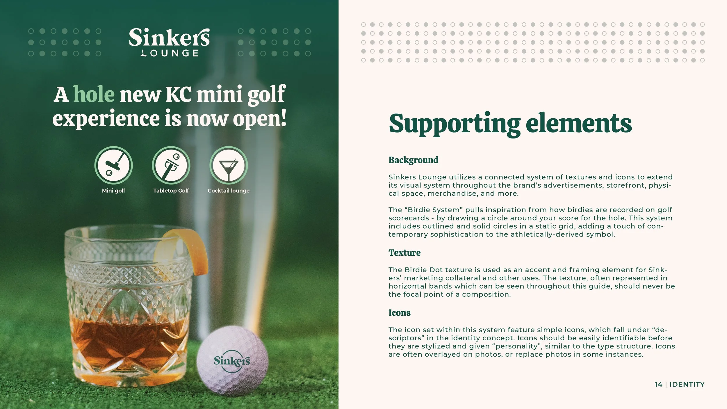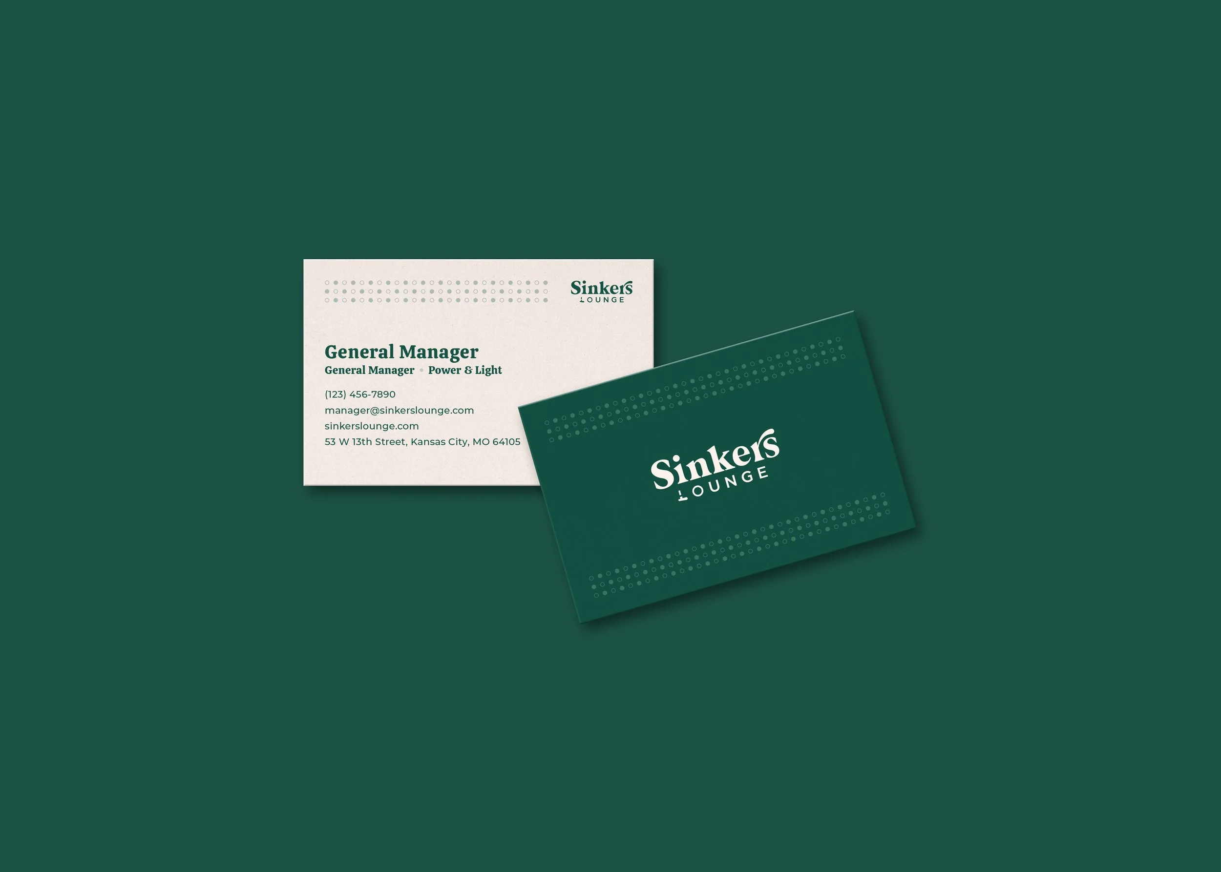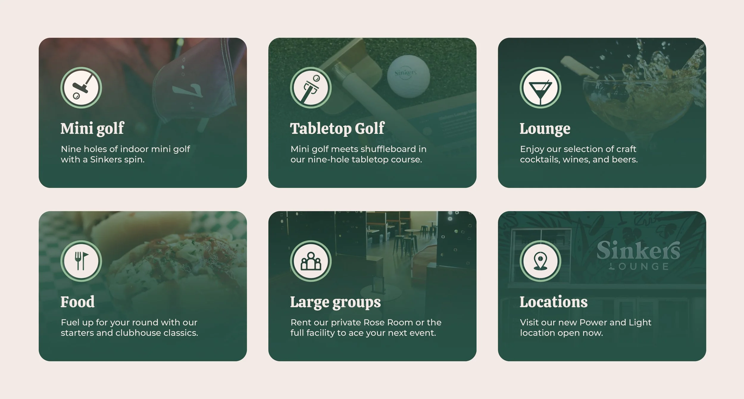 The Sinkers Lounge brand was designed to stand out from other similar indoor mini golf venues by avoiding an arcade-like experience. Instead, a country club-like environment was envisioned to offer a less obnoxious setting for large corporate events while providing photogenic qualities desired by those dressing up for a night out in the Power and Light District.
