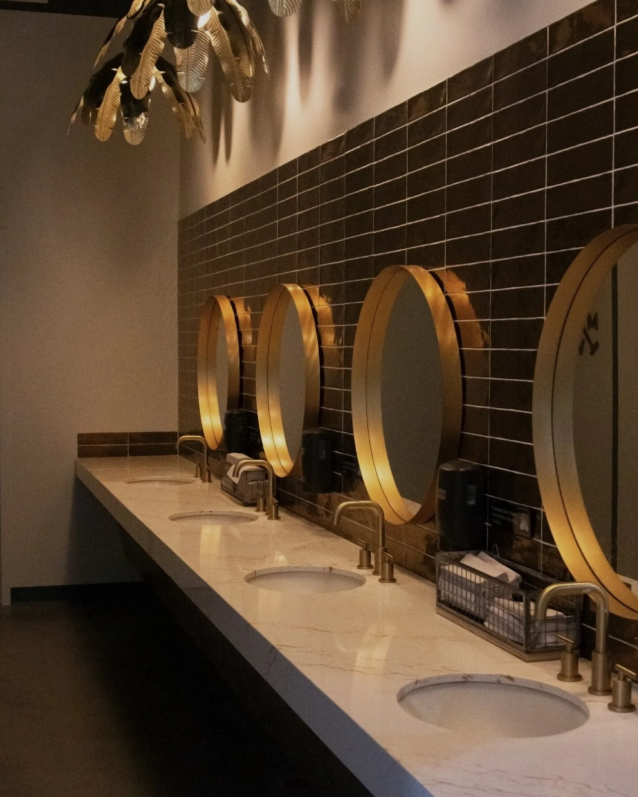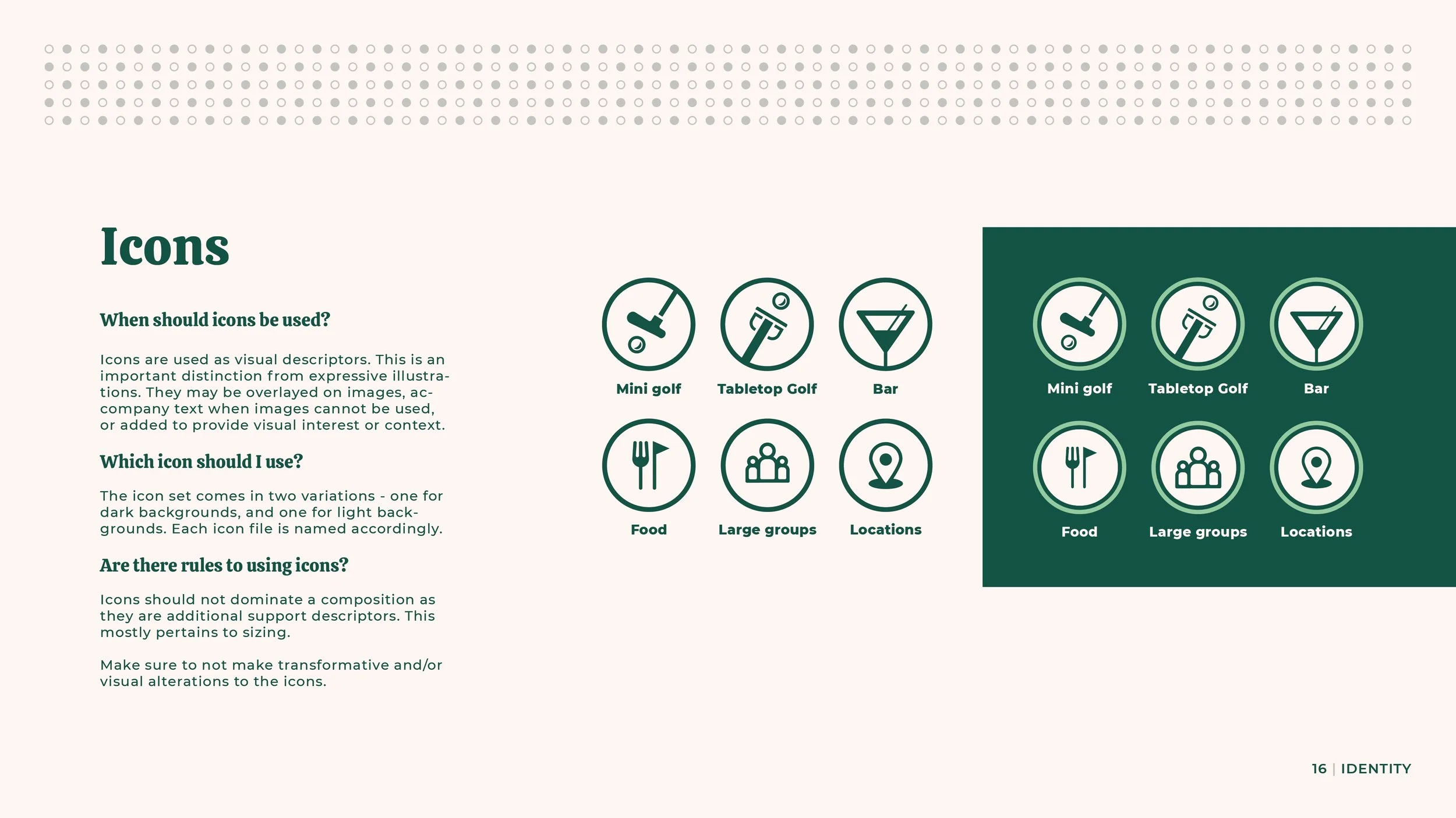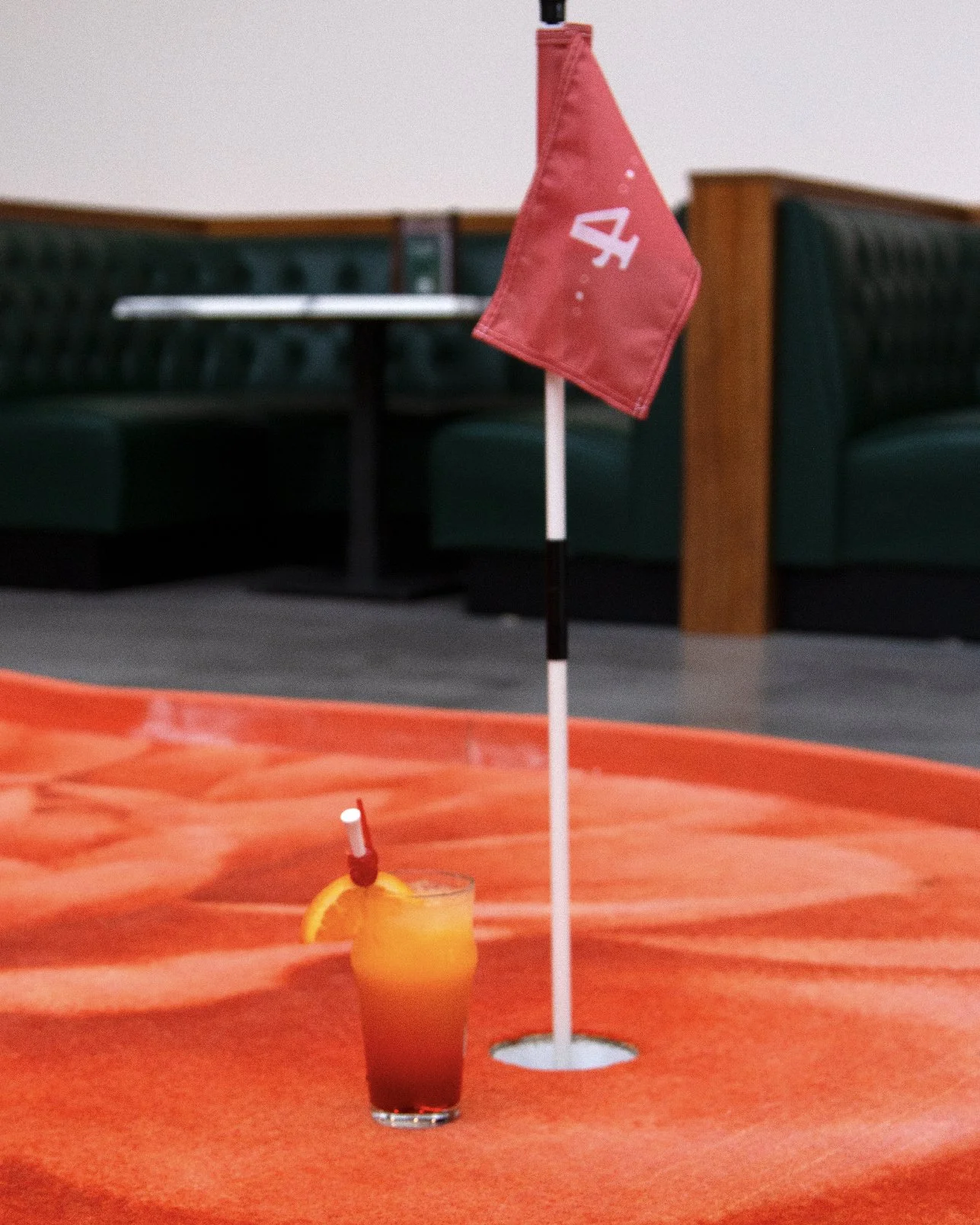 The Sinkers Lounge brand was designed to stand out from other similar indoor mini golf venues by avoiding an arcade-like experience. Instead, a country club-like environment was envisioned to offer a less obnoxious setting for large corporate events while providing photogenic qualities desired by those dressing up for a night out in the Power and Light District.